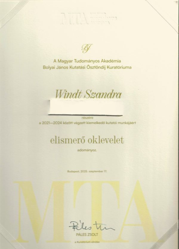 | 2025 | Elismerő oklevél – Magyar Tudományos Akadémia Bolyai János Kutatási Ösztöndíj Kuratóriuma | |